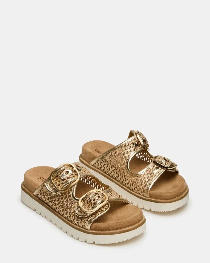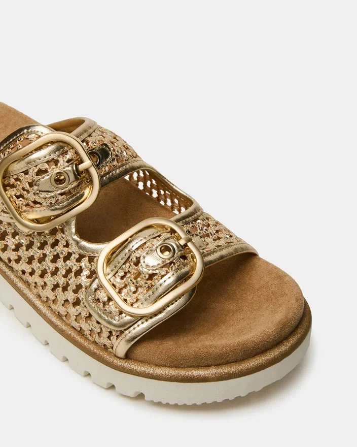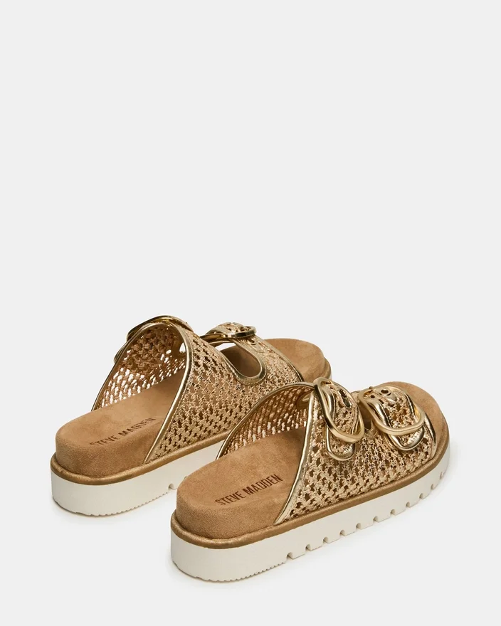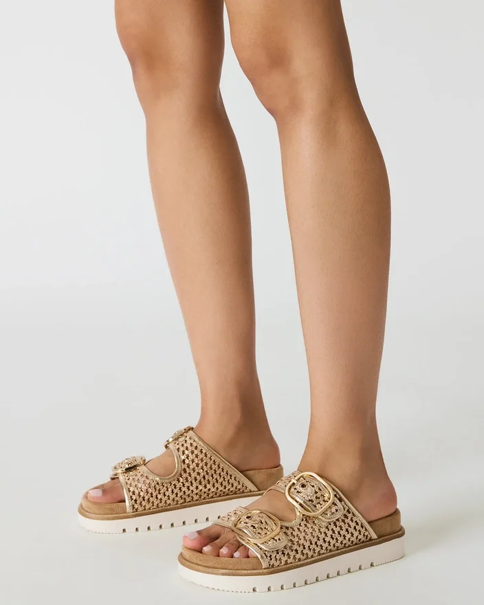 Shellby Gold är en skickligt tillverkad vävd sandal designad för bekvämlighet och stil. Sandalen har säkra spännen som ger justerbar passform och stabilitet hela dagen. En konturerad fotbädd ger stöd för fotvalvet och dämpning, vilket gör denna mångsidiga sandal idealisk för både vardagsstil och avslappnade tillfällen. Den vävda konstruktionen ger ett andningsbart material som är perfekt för varmt väder.