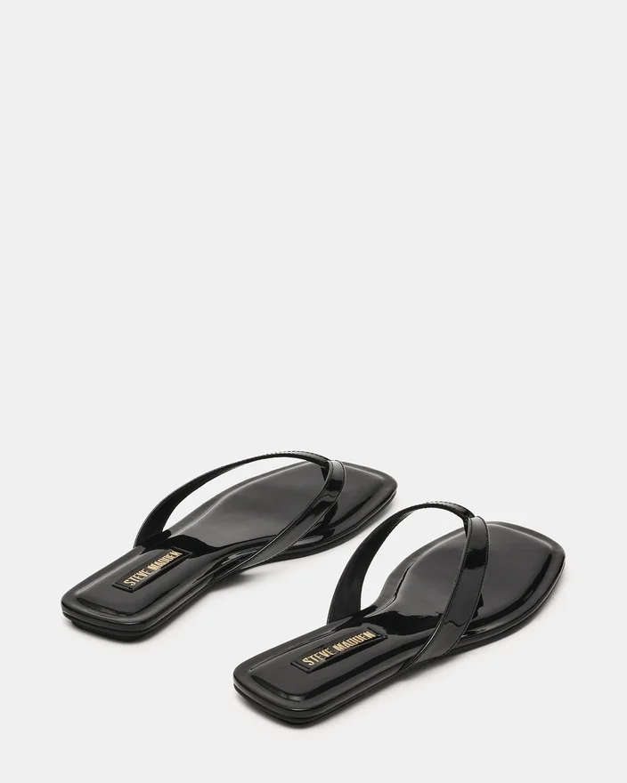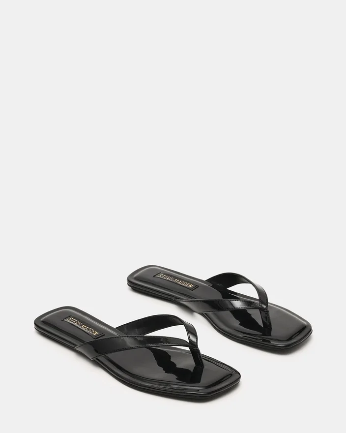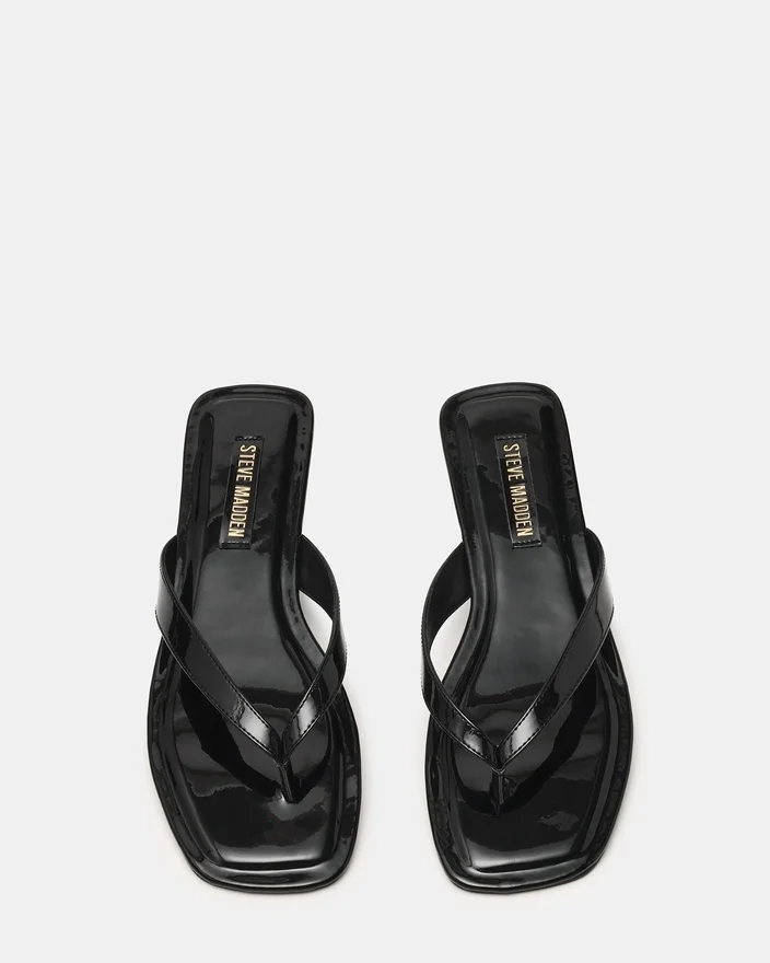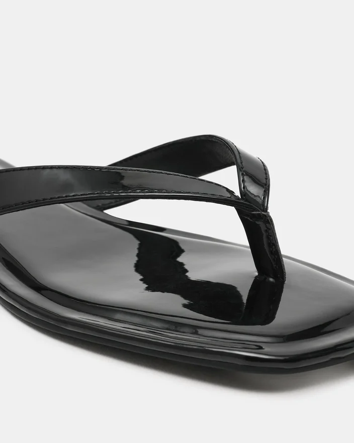 Trella Black Patent-sandal har en modern design med fyrkantig tå i kombination med en minimalistisk rem, vilket ger både stil och komfort. Tillverkad av kvalitetsmaterial ger den ett raffinerat utseende som passar för olika tillfällen. Den eleganta silhuetten framhäver fotens form samtidigt som den säkerställer en säker passform, vilket gör den till ett utmärkt val för dem som söker diskret elegans i skor för varmt väder.