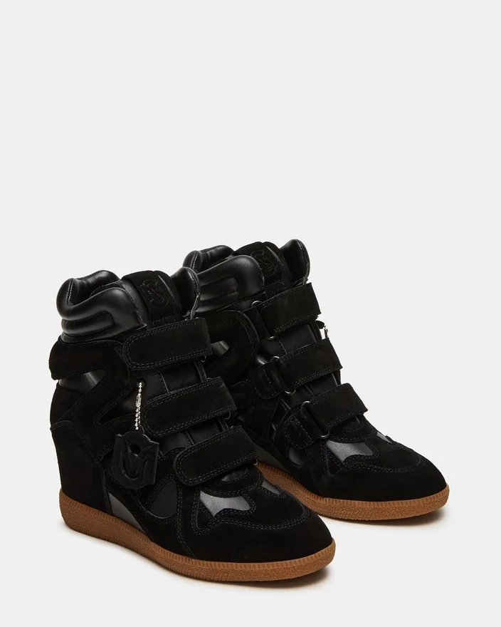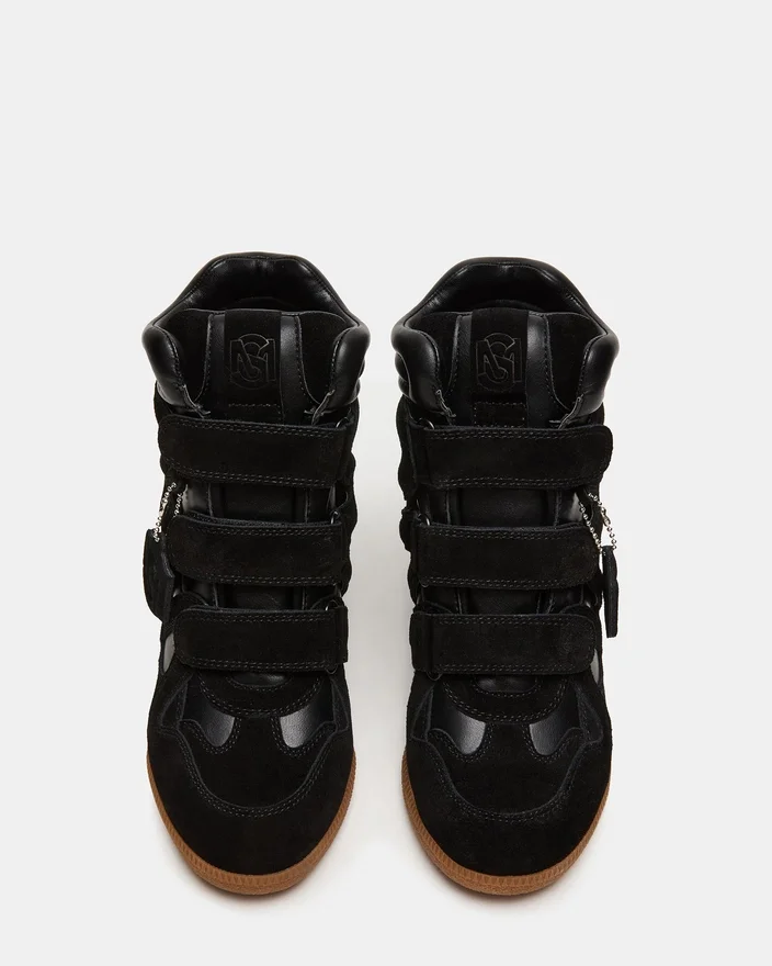Mavis svart mocka high-top-Sneaker kombinerar klassisk stil med modern bekvämlighet. Tillverkad av premiummaterial erbjuder den hållbarhet och ett raffinerat utseende. Kardborreförslutningen säkerställer en säker passform och gör den enkel att ta på och av, vilket gör den idealisk för dem som söker både komfort och funktionalitet. Perfekt för att lyfta Vardagsstil-outfits med en elegant, professionell touch.