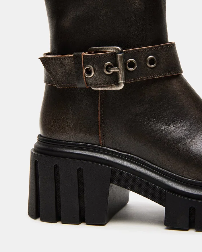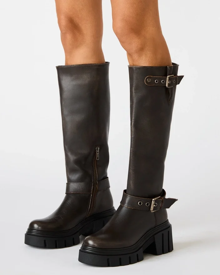 Dessa Brigade-stövlar har en unik motorcykeldesign och spänndetaljer, vilket gör dem till ett stilfullt val till alla kläder. Med sin knähöga passform med grovt mönster kombinerar dessa stövlar mode och funktionalitet. Det perfekta tillskottet till varje garderob för en trendig och tuff look.