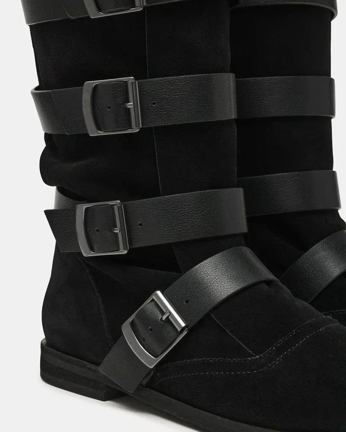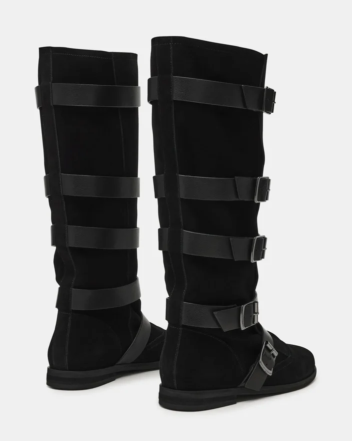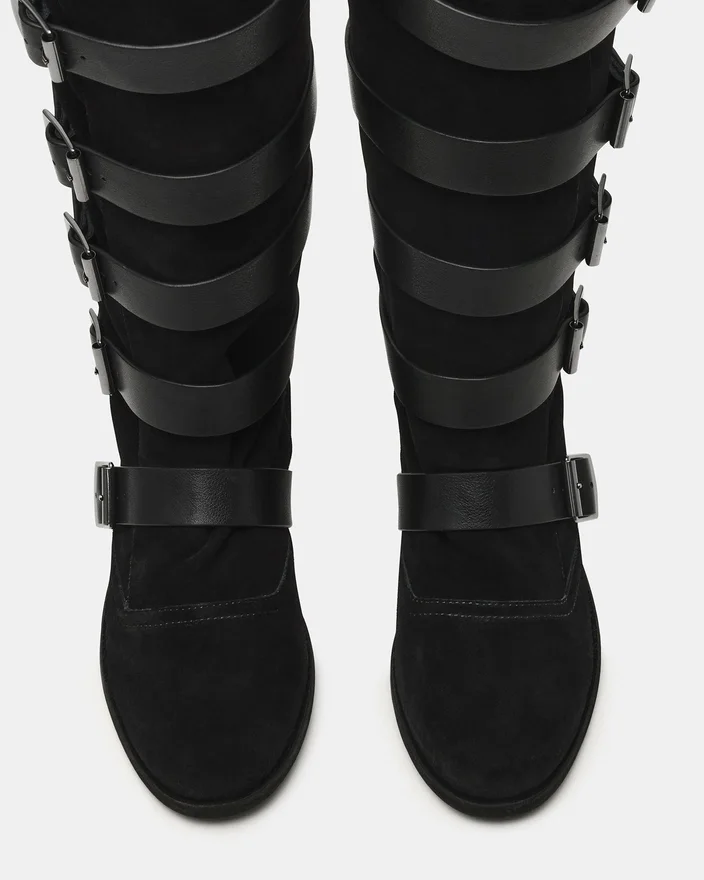 Indio Black Suede-stövlen är ett exempel på tidlös design med sin runda tå och spänndetaljer. Dessa remmar ger en unik look samtidigt som de bidrar med visuellt djup till silhuetten. Denna stövl når upp till knähöjd och erbjuder utökad täckning och en imponerande närvaro som lyfter vilken outfit som helst.