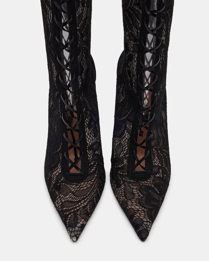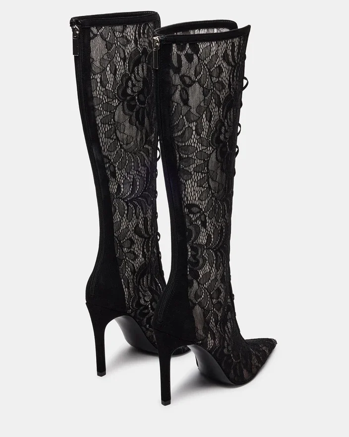 Gör ett djärvt intryck med Maxine Black Lace, en sofistikerad knähög snörstövlad stövlformad designad för dem som vill dra uppmärksamheten till sig. Med en vass spetsig tå och en iögonfallande stilettklack utstrålar denna modell elegans vid varje steg. Perfekt för att lyfta kvällslooken eller tillföra en dramatisk touch till vardagsgarderoben – denna stövlformade klackskor är ett måste för modeentusiasten.