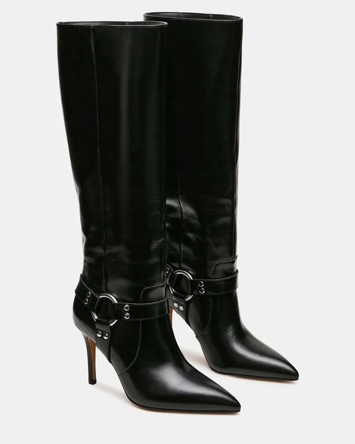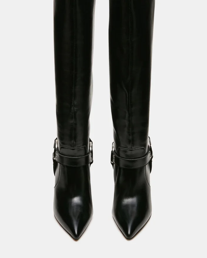 Talis svart läder är en knähög stövel med en elegant spetsig tå och metalliska accenter. Denna sofistikerade silhuett kombinerar tidlös stil med modern kant, vilket gör den till ett mångsidigt tillskott till vilken garderob som helst.