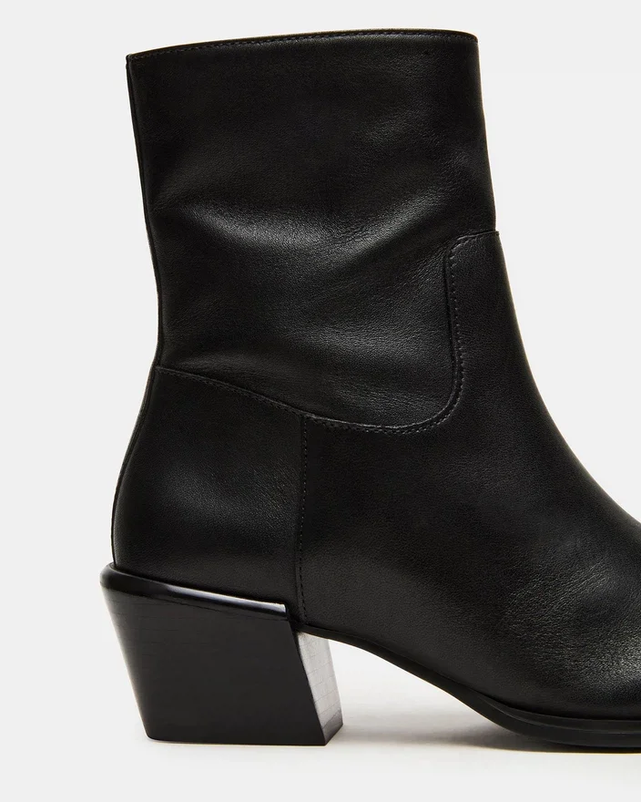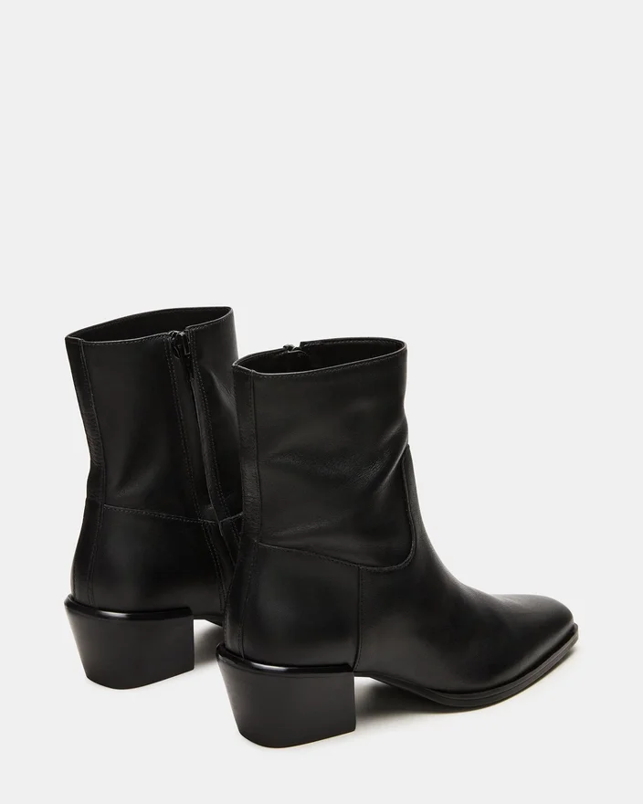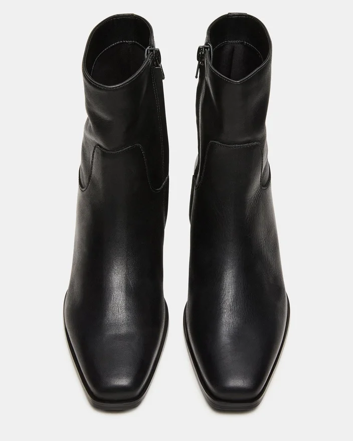 Daney svart läderankelstövlel med fyrkantig tå kombinerar modern design med sofistikerad komfort. Tillverkad av kvalitetsmaterial, erbjuder dess strukturerade fyrkantiga tå en modern touch samtidigt som den ger gott om utrymme för att bäras hela dagen. Den eleganta silhuetten och den robusta designen gör denna ankelstövlel till ett mångsidigt val, som smidigt lyfter både i vardagsstil och i mer eleganta outfits med expertstil och raffinerad funktionalitet.