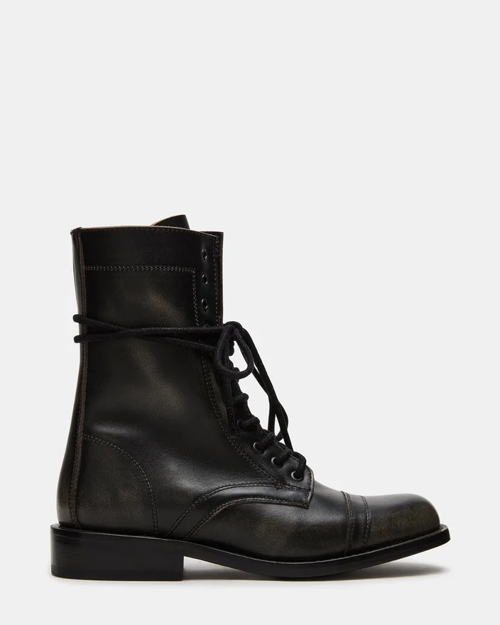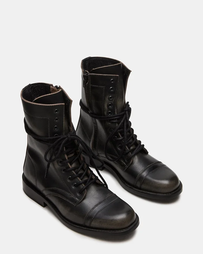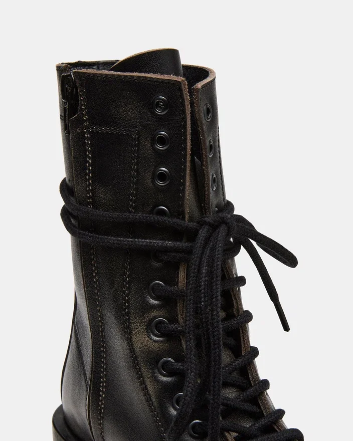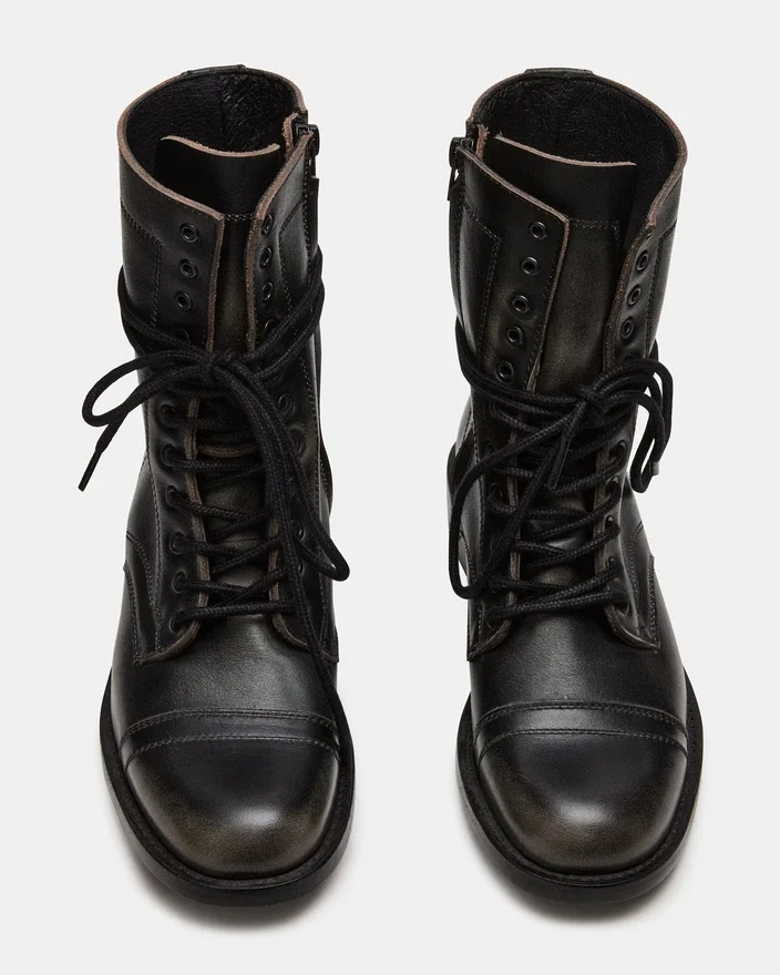 Theron Black Distressed snörningsbar motorkombat-ankelstövlet kombinerar en robust stil med en hållbar konstruktion. Denna stövlel har en sliten finish som ger en extra touch till vilken outfit som helst. Den säkra snörningsdesignen garanterar en anpassad passform, medan den robusta sulan erbjuder grepp och stöd som passar för vardagens äventyr.