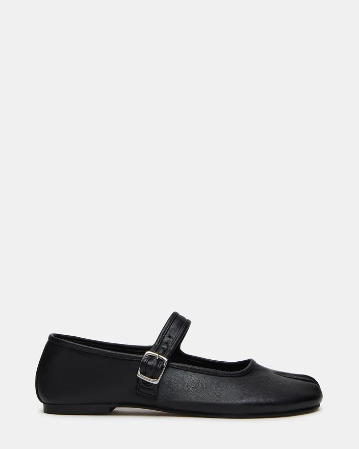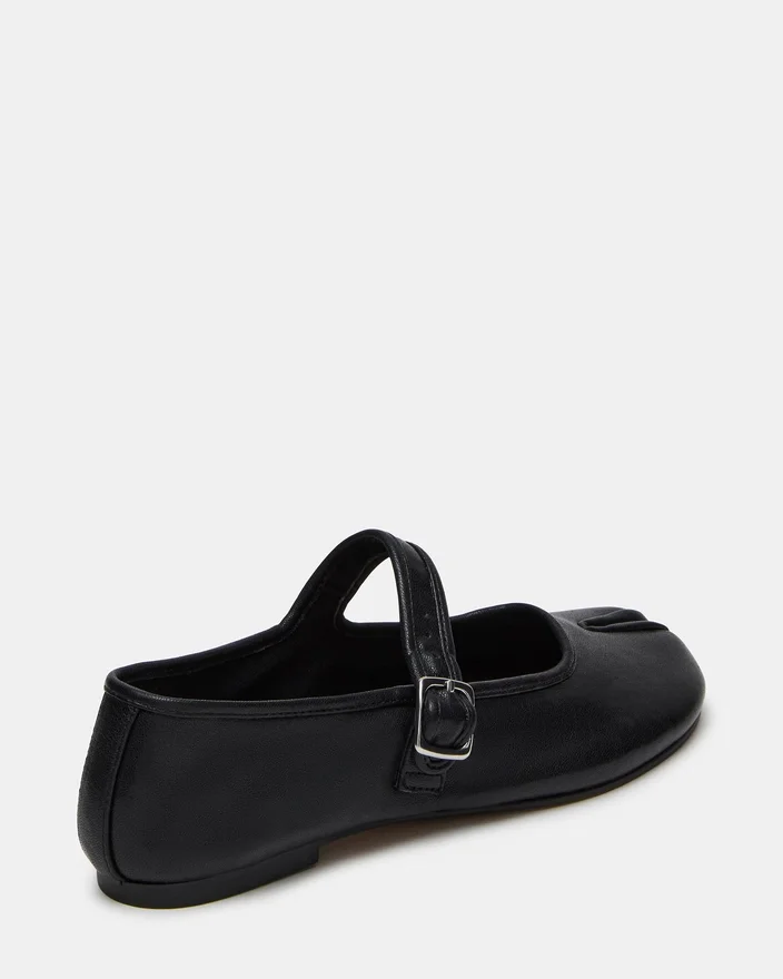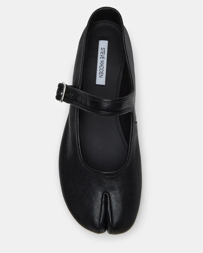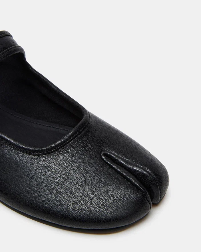 Calara svart läder kombinerar modern design med tidlös elegans. Denna Tabi-skor har en graciös ballerinasilhuett som smidigt övergår från vardagsstil till eleganta sammanhang. Mary Jane-remmen säkerställer en säker, justerbar passform, och den platta sulan ger komfort hela dagen utan att kompromissa med stilen. Perfekt för dig som söker en distinkt sko som balanserar innovation med klassisk charm.
