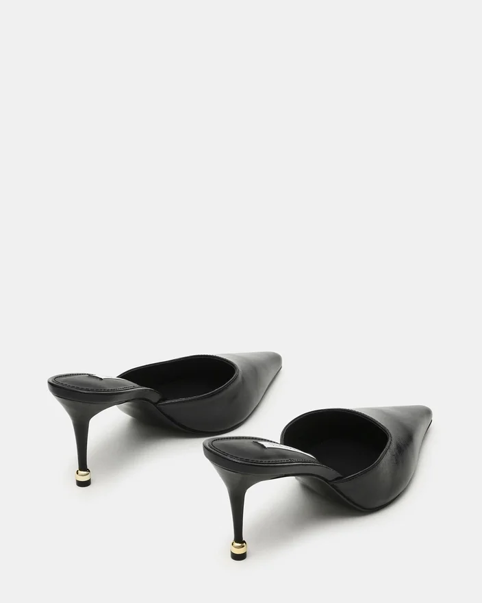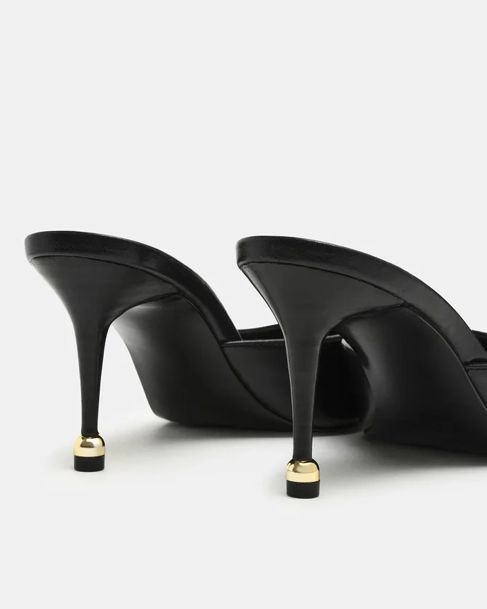 Adeline Black Leather är en elegant mule med spetsig tå och raffinerade guldfärgade detaljer på klacken för en elegant vardagslook. Designen erbjuder smidig stylingmångsidighet och övergår sömlöst från kontoret till kvällsklädsel. En sofistikerad basplagg som kombinerar komfort med modern elegans.