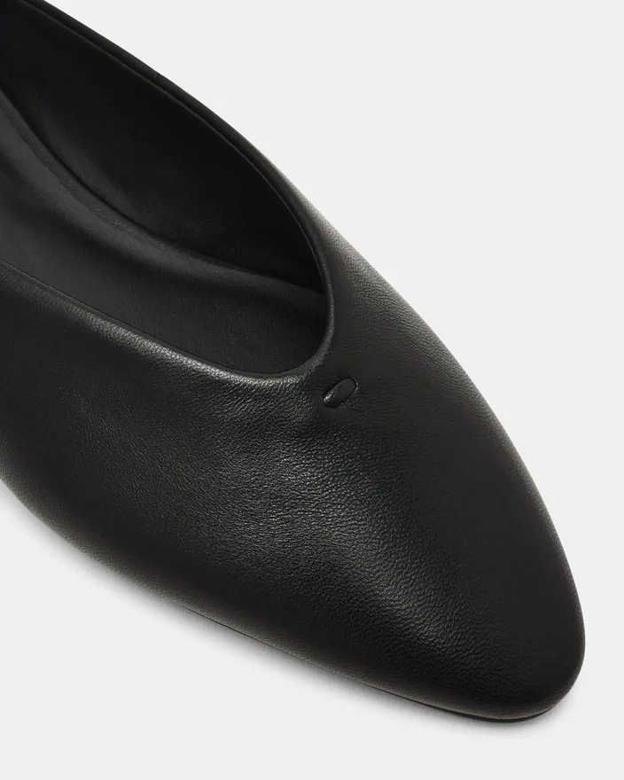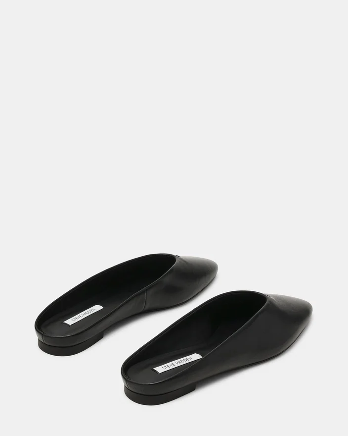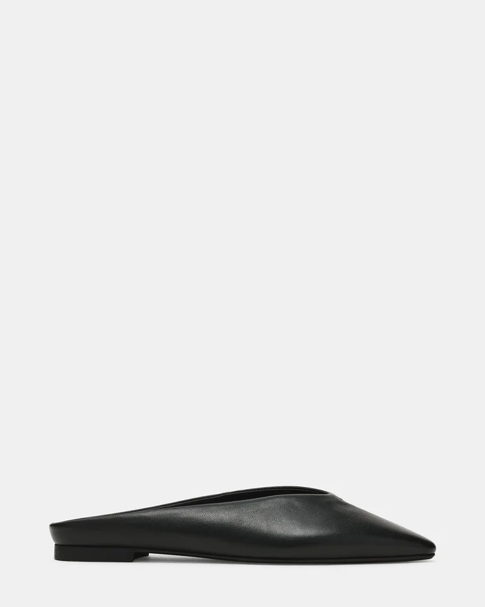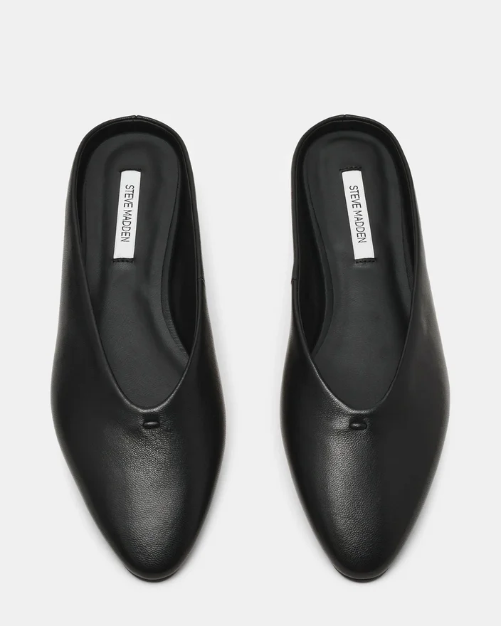 Sherman Black Leather Mule utstrålar diskret elegans med sin mandelformade tå och bekväma slip-on-design. Denna platta sko erbjuder komfort hela dagen utan att kompromissa med stilen, vilket gör den till ett måste i varje garderob. Den strömlinjeformade designen passar lika bra på kontoret som på kvällen, medan den säkra passformen garanterar stabilitet hela dagen.