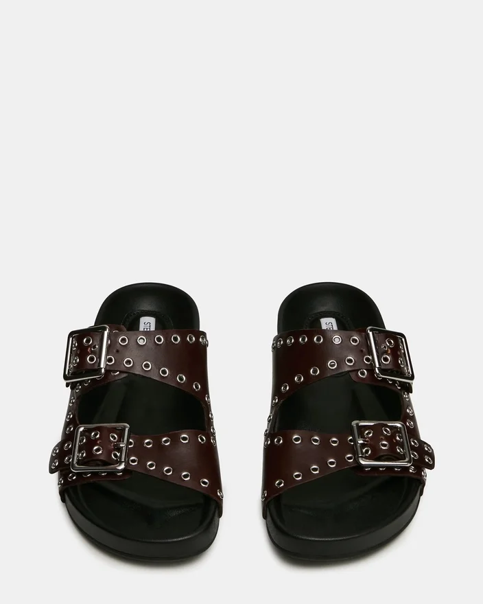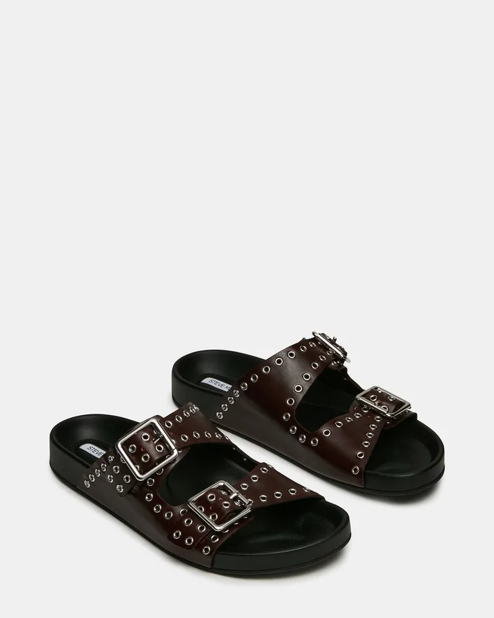 Abott Burgundy Leather Slide Sandal kombinerar diskret elegans med praktisk komfort. Överdelen pryds av intrikata ögledetaljer, medan dubbla spännen säkerställer en anpassningsbar och säker passform. Den stödjande fotbädden är konstruerad för långvarigt bruk, vilket gör detta till ett sofistikerat val för dem som kräver både stil och funktionalitet i sina vardagsskor.