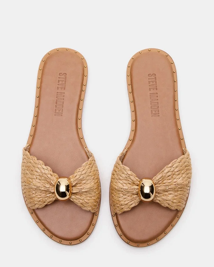 Denna Dipsy-sandal har små nitar och en rundad tå för extra stil och komfort. Dessa sandaler är den perfekta kombinationen av mode och praktiskhet och ett måste i varje garderob. Med sin design i naturlig raffia tillför de en touch av rustik charm till vilken outfit som helst.