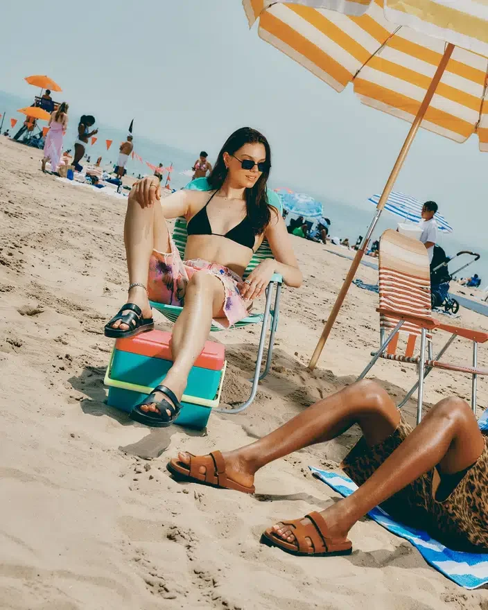 Mayven-sandalen har bekväma detaljer som en formgjuten fotbädd, en mönstrad platt sula och en justerbar rem överst, samt en främre rem med geometriska utskärningar.