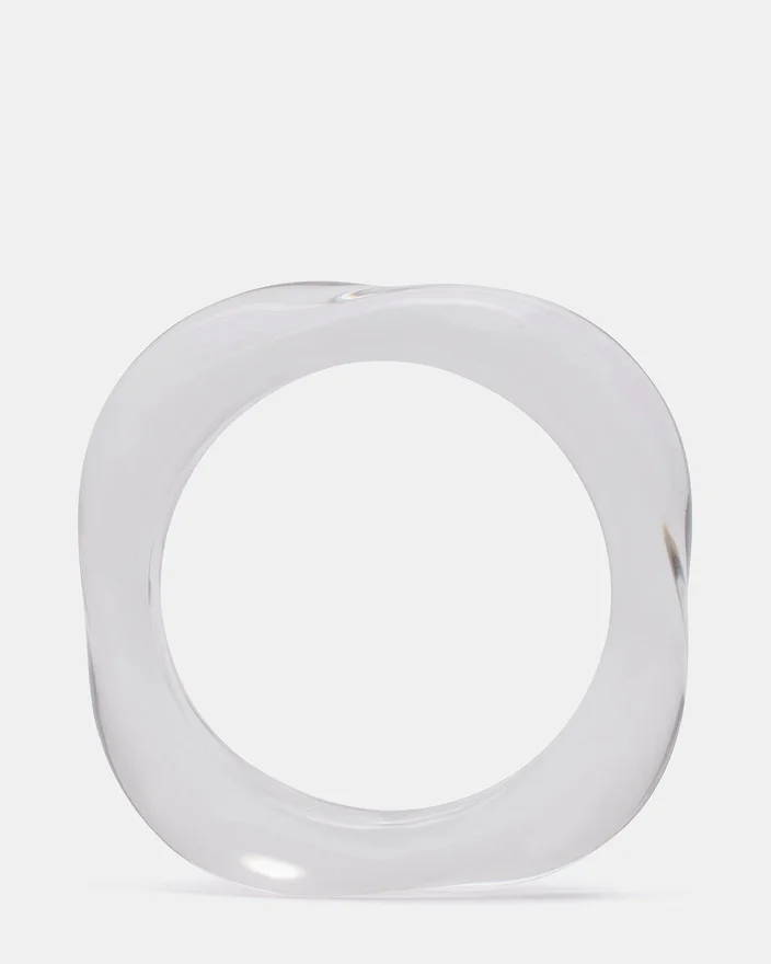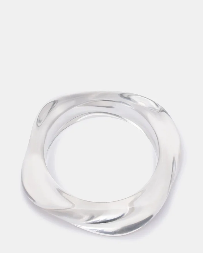 Detta böjda retroarmband i klar plast förmedlar vintageestetik med en transparent design som passar perfekt till alla kläder. Den mjukt böjda silhuetten smickrar handleden samtidigt som den bevarar den nostalgiska känslan. Tillverkat med klarhet i åtanke fångar det genomskinliga materialet ljuset vackert, vilket gör det till ett diskret men ändå iögonfallande accessoar. Perfekt att kombinera med andra smycken eller bära ensamt. Detta armband förenar tidlös design med modern modekänsla.