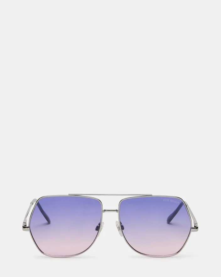 Graysen-solglasögon i silver har en tidlös aviator-design med en elegant silverram som ger klassisk stil med en modern touch. De blå gradientglasögonen övergår smidigt från djupare blått upptill till ljusare toner nedtill, vilket erbjuder både UV-skydd och en sofistikerad estetik. Perfekta för soliga dagar och tillräckligt mångsidiga för att komplettera vilken outfit som helst.