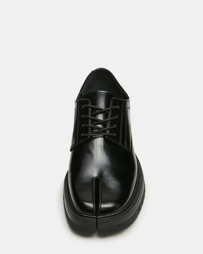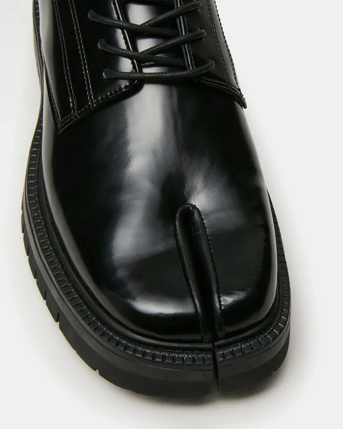 Jaxel Black Box kombinerar modern design med traditionellt hantverk och har en distinkt silhuett med delad tå. Denna snörningsbara herrskor förenar Tabi-skor med raffinerad skrädderi och erbjuder ett djärvt alternativ för dem som söker arkitektoniska skor. Den strukturerade konstruktionen och de högkvalitativa materialen ger både visuell effekt och varaktig komfort, vilket gör den till ett perfekt val för modemedvetna yrkesverksamma.