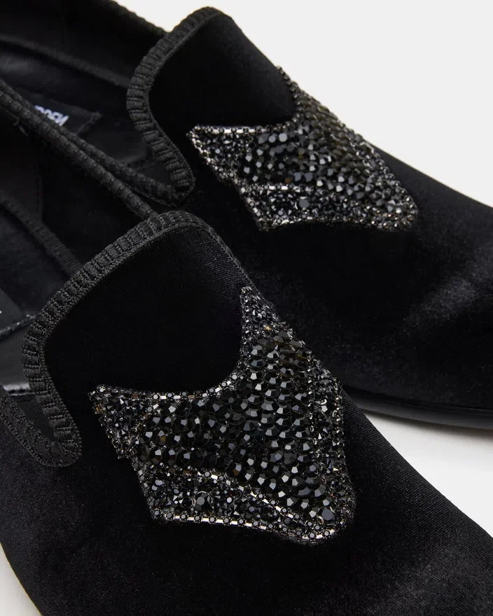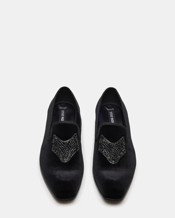 Förbättra din skokollektion med Finn Black Velvet, en sofistikerad slip-on-Loafer tillverkad av lyxiga material och prydd med en iögonfallande strassdekoration i form av ett rävhuvud. Denna raffinerade design passar lika bra till vardagsstil som till festliga tillfällen och erbjuder både komfort och en distinkt stil.