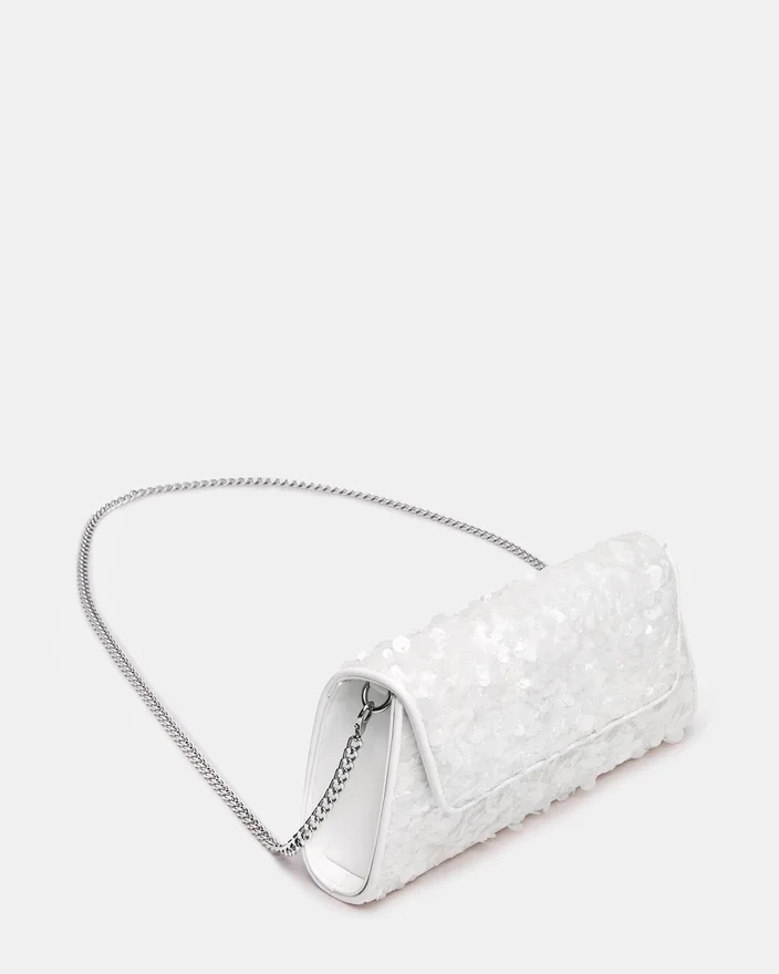 Förhöj din kväll med denna eleganta Avant Bag-paljettclutch, som har en distinkt trapezformad silhuett förfinad med franska kantdetaljer. Den klassiska designen med lock på framsidan stängs med ett magnetlås, medan insidan håller ordning på dina nödvändigheter med särskilda kortfack. Gå smidigt från clutch till crossbody-väska med den avtagbara kedjeremsan, som erbjuder mångsidig styling för alla tillfällen. Tillverkad av lyxiga paljettmaterial för kvällen, ger denna väska raffinerad glamour och praktisk elegans.