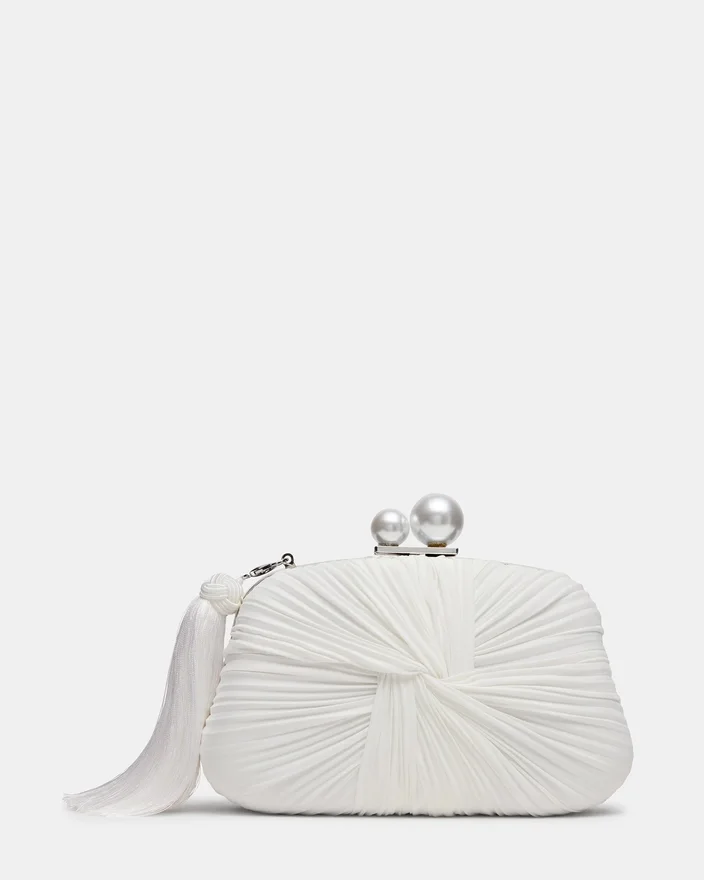 Rosalie-väskan i vitt kombinerar arkitektonisk elegans med raffinerat hantverk. Denna strukturerade timglasformade clutch har en metallram och handrynkat mikroplisserat siden, accentuerat av ett slående vridet motiv i mitten. En lyxig avtagbar vit tofs med flätad ändknopp och asymmetrisk pärlknäppning tillför sofistikerade detaljer. Den intuitiva push-pull-mekanismen garanterar enkel åtkomst, medan kortfacken på insidan håller ordning på det väsentliga. Gå smidigt från dag till kväll med den medföljande avtagbara kedje-crossbody-remmen, som erbjuder mångsidiga stylingalternativ för alla tillfällen.