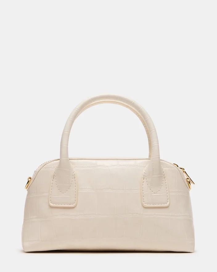 Melodie-väskan i benkrokodil har ett mångsidigt handtag på ovansidan i kombination med en avtagbar axelrem för flexibel användning. Förstärkt med en charmig, avtagbar björncharm och en färgglad scarf, ger den en sofistikerad touch till din outfit. Förvara dina nödvändigheter säkert med dragkedjan, medan innerfickan på baksidan erbjuder organiserad förvaring för mindre föremål. Denna väska kombinerar stilfulla accenter med praktisk design, perfekt för raffinerad, daglig användning.